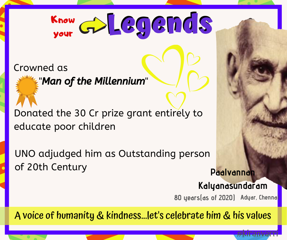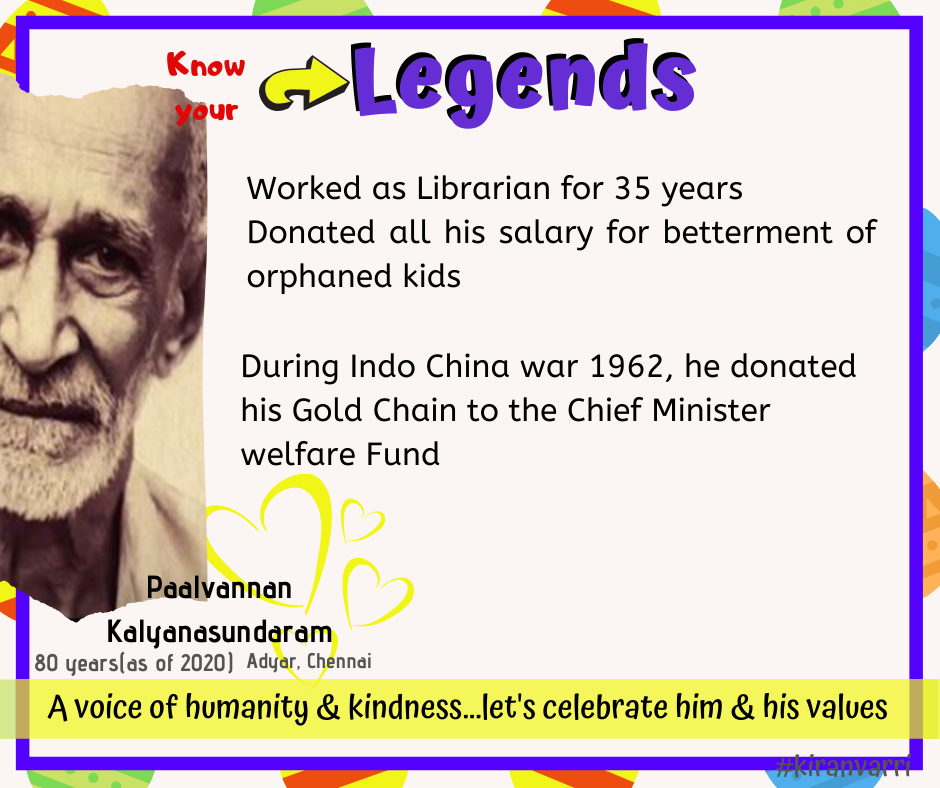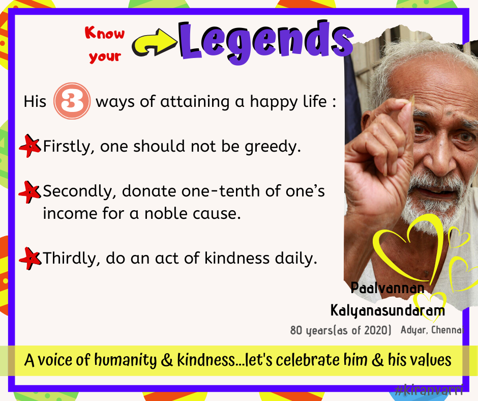 Post Date : 16 Feb 2020 // Know Ur Living Legends >> Truly the RICHEST man on Earth, Mr Paalvannan Kalyanasundaram >> a noble human being (from our own Chennai) has given away “ALL” he earned since the age of 14; even gave away his pension fund and the 3️⃣0️⃣Cr he was awarded for his contribution to society.